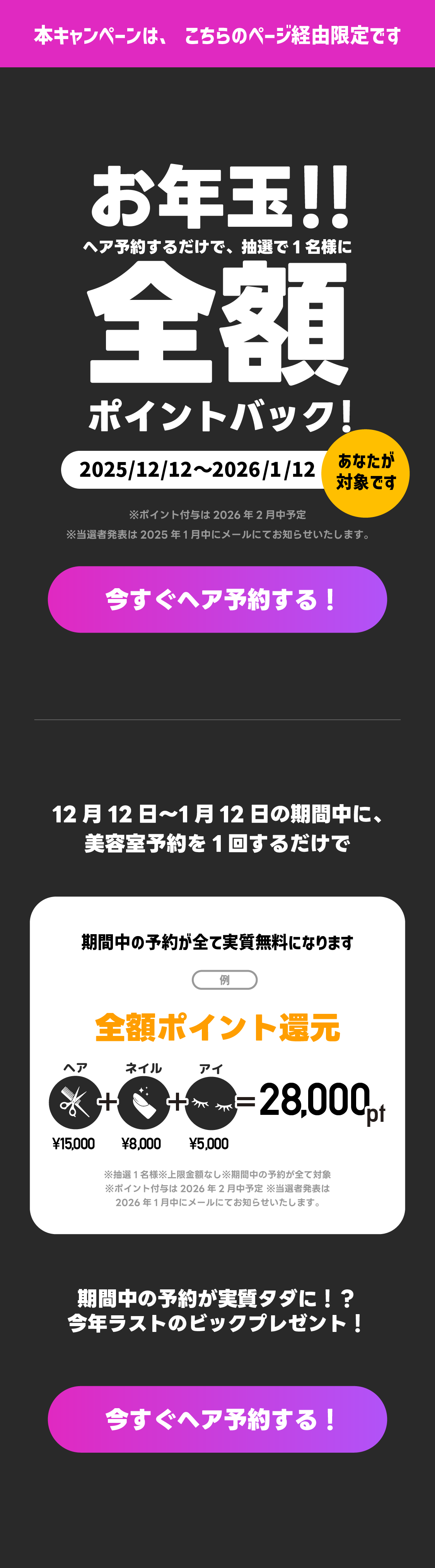 ■ キャンペーン概要 ・施術日が 2025年12月12日〜2026年1月12日 のご予約が対象 です(予約リクエスト送信日ではなく施術日基準)。 ・対象期間中に ヘア予約を1回以上施術完了された方の中から、抽選で1名様に「期間中の全予約の決済金額(実際にお支払いされた金額)を全額ポイントバック」 いたします。 ・本キャンペーンは、ヘア・ネイル・アイのすべてのカテゴリーの予約が対象です。 ・本キャンペーンは割引ではなく ポイント付与による還元 のため、決済時には割引されません。 ■ クーポン・ポイント利用時の扱い ・クーポン利用予約も対象となります。 ただし、クーポンで割引された分はポイント還元対象外 となり、「実際の決済金額(お客様が支払った金額)」のみをポイントバックします。 ・ポイント利用予約も対象となります。ただし、利用したポイント相当額は還元対象外 となり、実際の決済金額(差額分)のみをポイントバックします。 ・また、決済時に自動付与される通常ポイント(1%など)も、 最終的なポイントバック額から差し引いて付与 されます。 (=二重付与にならないよう調整) 例:予約金額 5,000円 / クーポン1,000円利用のケース → 実際の支払金額 = 4,000円 → 自動付与ポイント(例:40pt)を引いた 3,960pt をキャンペーン分として付与 ■ ポイント付与について ・通常のポイント(決済時の1%等)は決済完了後に付与されます。 ・キャンペーンによる 追加還元(全額ポイントバック)は2026年2月中に付与されます。 ・付与されたポイントはネイリービューティー内でのみ利用できます。 ・ポイントの換金・譲渡・他サービス利用はできません。 ・不正行為が確認された場合、付与済みポイントを取り消します。 ■ キャンペーン対象外となる場合 以下の場合、キャンペーン対象外となります: ・予約がキャンセルされた場合 ・返金が発生した場合 ・ヘア施術を期間中に1回以上完了していない場合 ・複数キャンペーン利用時、当社が指定するキャンペーンのみ適用 ・利用規約に違反する行為、または不正と判断される行為があった場合 ■ その他注意事項 ・本キャンペーンは予告なく変更または中止となる場合があります。 ・システム障害や通信環境により、正常に抽選対象登録・ポイント付与ができない場合があります。 ・ポイントの利用条件や有効期限などはネイリービューティー利用規約をご確認ください。 ・本キャンペーンに関するお問い合わせはネイリービューティー運営事務局まで support@nailie.jp